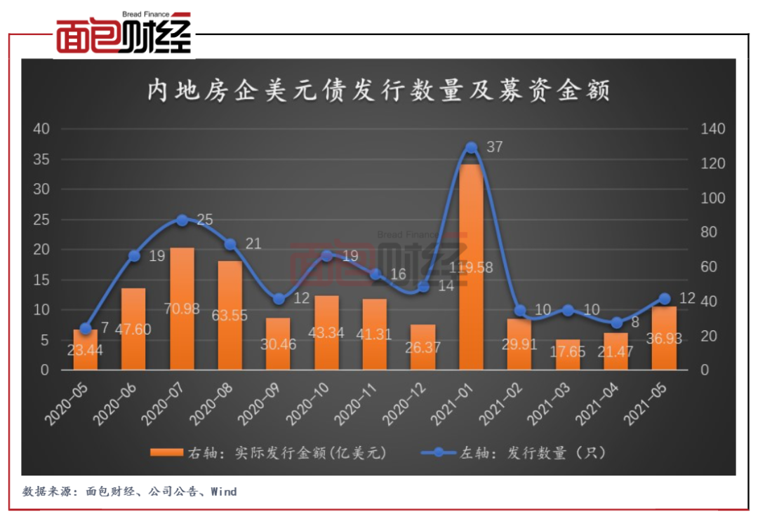 根據Wind數據,按照起息日口徑統計,2021年5月,國內房地產開發企業中共有12個債務主體發行境外美元債,共發行美元債12只,融資金額為36.93億美元,環比增長72.01%,同比增長57.55%。