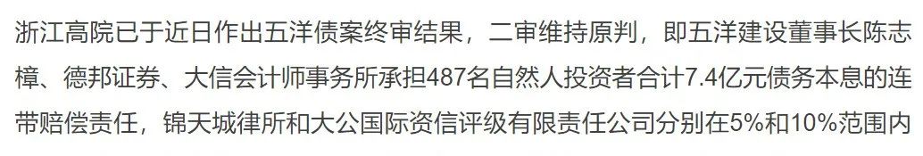 在此之前的2021年9月末,備受債券市場關注的五洋債二審判決已出結果,二審判決維持原判,德邦證券、大信會計師事務所、錦天城律師事務所和大公國際均需要承擔一定的賠償責任。目前提請上訴的是德邦證券,尚未看到會計師事務所、律師事務所和評級機構的上訴信息。