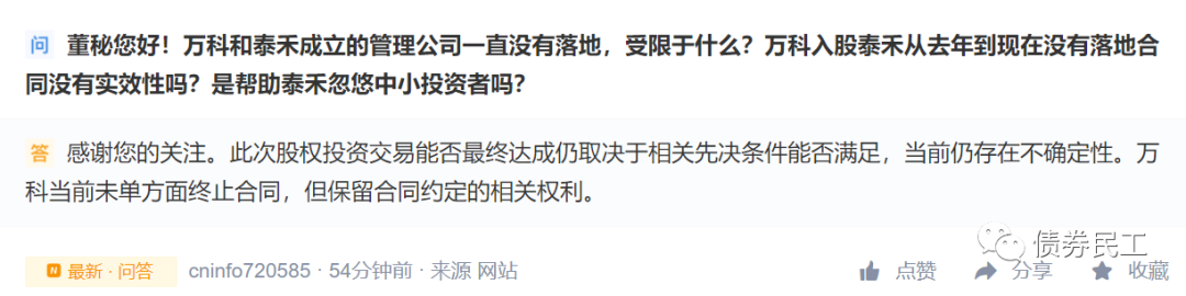 2、2021年6月1日,萬科董秘在深交所互動平臺中明確表示,萬科和泰禾的合作事宜最終能否達(dá)成取決于相關(guān)先決條件能否滿足,目前仍然存在不確定性。在2020年7月31日,深陷違約泥潭的泰禾集團(tuán)公布了重磅消息:萬科正式入股泰禾集團(tuán),將持有泰禾集團(tuán)19.9%股份。當(dāng)時這筆交易存在明確的先決條件泰禾制定債務(wù)重組方案并與債權(quán)人達(dá)成一致、萬科對泰禾完成盡調(diào)且就發(fā)現(xiàn)問題的解決方案及擬議交易的方案達(dá)成一致。