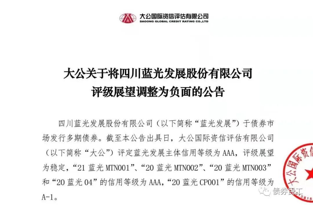 1、2021年6月1日,四川藍(lán)光發(fā)展股份有限公司(以下簡稱“藍(lán)光發(fā)展”)發(fā)布公告,大公國際決定維持藍(lán)光發(fā)展主體信用等級AAA,評級展望調(diào)整為負(fù)面。評級展望調(diào)整為負(fù)面的主要原因是部分項(xiàng)目去化壓力較大、新增土地儲備規(guī)模減少、盈利能力有所下滑、短期償債壓力較大等。而在大公國際調(diào)整藍(lán)光發(fā)展的評級展望之前,標(biāo)普于2021年5月31日將藍(lán)光發(fā)展的長期發(fā)行人信用評級從“B+”下調(diào)至“B-”,并置于負(fù)面信用觀察名單。