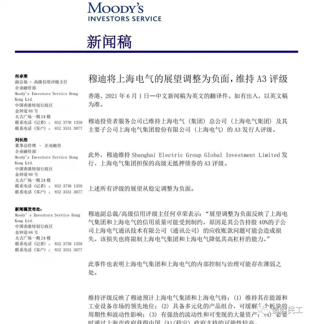 3、2021年6月1日,穆迪將上海電氣(集團(tuán))總公司及其核心子公司上海電氣集團(tuán)股份有限公司的評級的展望從“穩(wěn)定”調(diào)整為“負(fù)面”。在上海電氣集團(tuán)股份有限公司5月31日的公告中,公司持股40%的控股子公司上海電氣通訊技術(shù)有限公司應(yīng)收賬款普遍逾期,最終可能對公司造成83億元的損失。此次應(yīng)收賬款逾期事件在市場上引起了較大的關(guān)注,后續(xù)進(jìn)展和信息披露尤其引人注意。