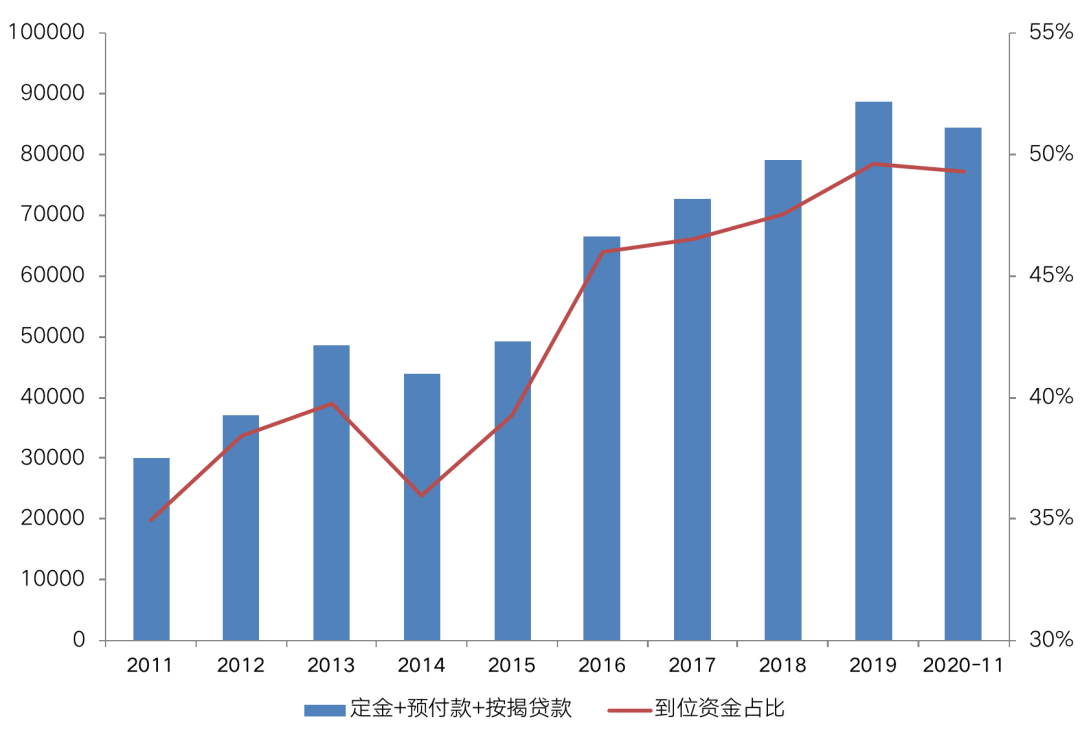 在房企項(xiàng)目開(kāi)發(fā)過(guò)程中,銷售回款最重要的資金來(lái)源。自2014年以來(lái),銷售回款逐年上升,在房地產(chǎn)開(kāi)發(fā)到位資金的比重也不斷擴(kuò)大,增速明顯高于其他融資渠道。2020年11月,定金、預(yù)收款和個(gè)人按揭貸款合計(jì)占資金總額的比重為49.3%,基本占據(jù)半壁江山。