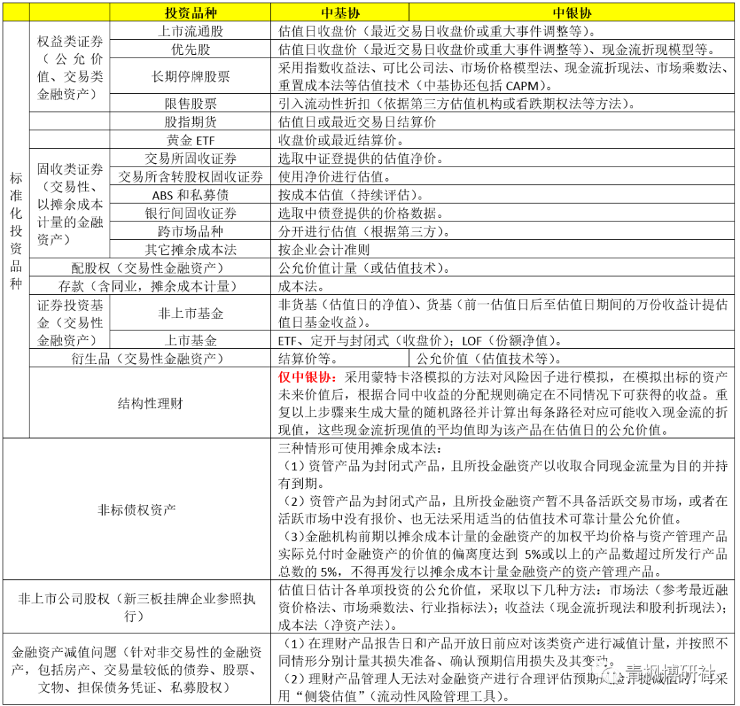 (四)中基協與中銀協關于資管投資品種估值標準的對比