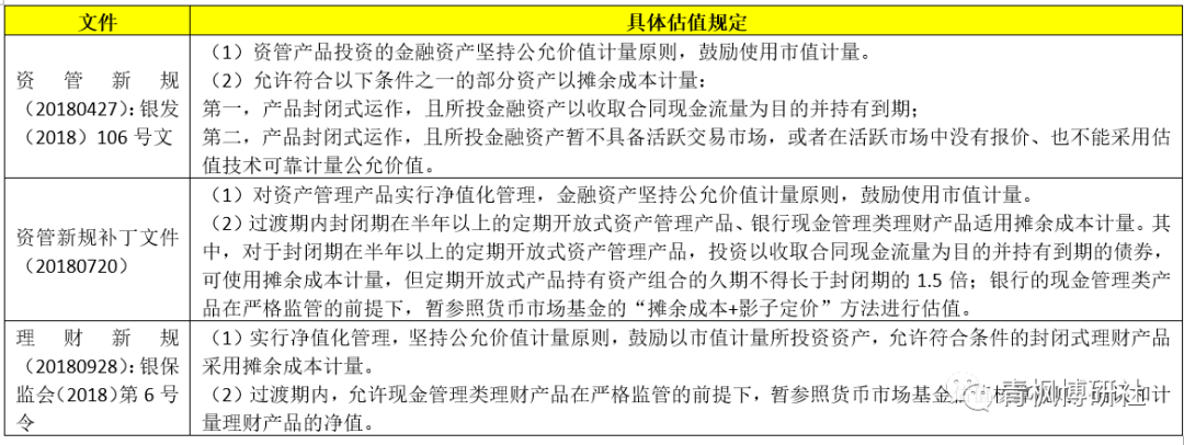 整體來看,一系列政策文件在過渡期內允許符合一定的封閉式產品以及現金管理產品采取攤余成本法之外,均鼓勵對資管產品以公允價值(含市價)方法進行估值。這里面可能需要給予關注的是現金管理類產品和封閉期在半年以上的定開產品。不過需要說明的是,即便是采用攤余成本法計量的貨幣基金,目前政策部門也在進行市值法試點。