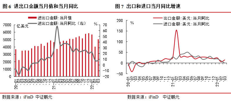 4月13日,海關總署公布3月和一季度外貿數據:按美元計,出口同比增速為14.7%,較1-2月16.3%的同比增速有所回落;進口同比出現負增長,增速由1-2月的15.5%降至3月的-0.1%;貿易順差為473.8億美元,明顯低于2021年下半年平均水平。總的來看,3月中國出口韌性繼續顯現,但受疫情影響,防控政策收緊、國際大宗商品價格高漲等因素開始成為進口回落的壓力來源,進口表現明顯不及預期。