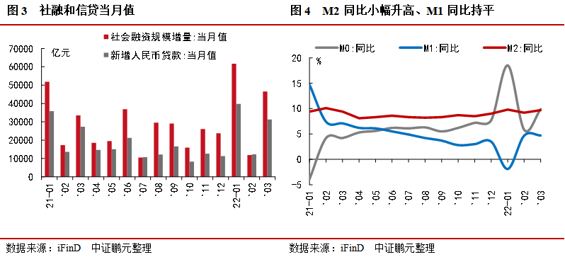 3月社融信貸總量超預期,信貸結構仍一般,短貸票據依舊貢獻主要增量、企業中長期貸款邊際好轉、居民中長期貸款依舊低迷,地產銷售仍不佳。近期國內疫情形勢嚴峻、經濟形勢出現超預期變化,經濟下行壓力加大,寬信用在慢推進,穩增長政策繼續加碼。
