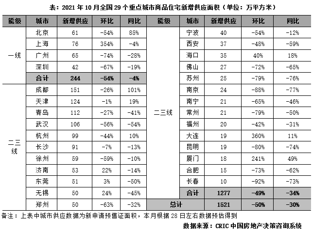 10月,因房地產市場下行加劇,房企推盤積極性回落,本月29個重點城市預估新增供應面積1521萬平方米,環比“腰斬”,同比下降3成,顯著不及去年同期。