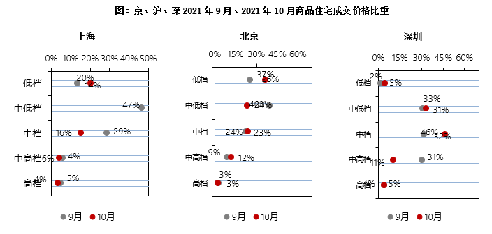 從價格段分布來看,低檔產品占比上海、北京和深圳分別上升7、11和3個百分點;中低檔產品占比上海和深圳分別上升9和2個百分點,北京下降16個百分點;中檔產品占比北京和深圳分別上升2和14個百分點,上海下降13個百分點;中高檔產品和高檔產品上海和深圳下降3和19個百分點,北京上升3個百分點。