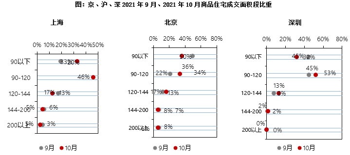 從面積段分布來看,90平方米以下產品占比上海上升14個百分點,北京和深圳分別下降14和12個百分點;90-120平方米產品占比北京和深圳分別上升12和7個百分點;120-144平方米產品占比上海、北京、深圳分別變化-5、4、5個百分點;144-200平方米產品以及200平方米以上大戶型產品成交占比上海和北京均下降3個百分點。