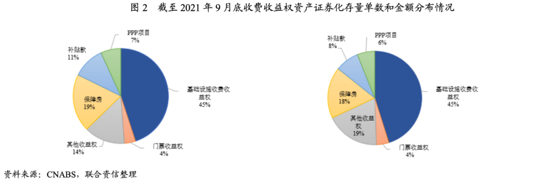 截至2021年9月底,處于存續期內的收費收益權項目共463單,存續金額合計3871.68億元。從存續的收費收益權項目的底層資產類型來看,截至2021年9月底,基礎設施收費收益權占比最高,其次為保障房項目,具體如下圖所示。
