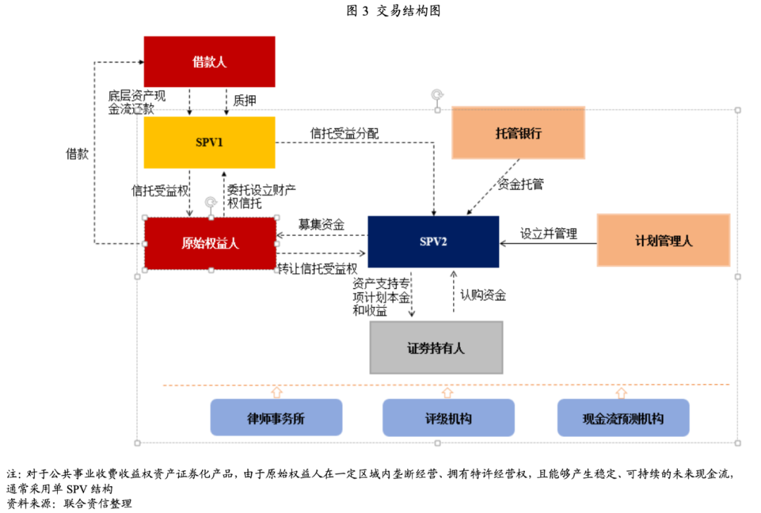 收費收益權是一種約定權利,即交易雙方根據基礎權利和交易所創制的一項約定權利,其本質是通過結構化的設計將未來一段時期的收費收益權利所產生的現金流提前變現。由于收費收益權資產證券化產品涉及的基礎資產會存在難以特定化、現金流回款時間與資產支持證券還本付息時間錯配或其他瑕疵,所以通常情況下采用雙SPV結構,其中SPV1通常為財產權信托,SPV2為資產支持專項計劃或資產支持票據信托,交易結構圖如下圖所示。