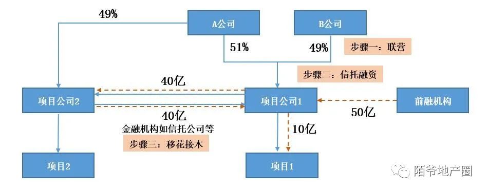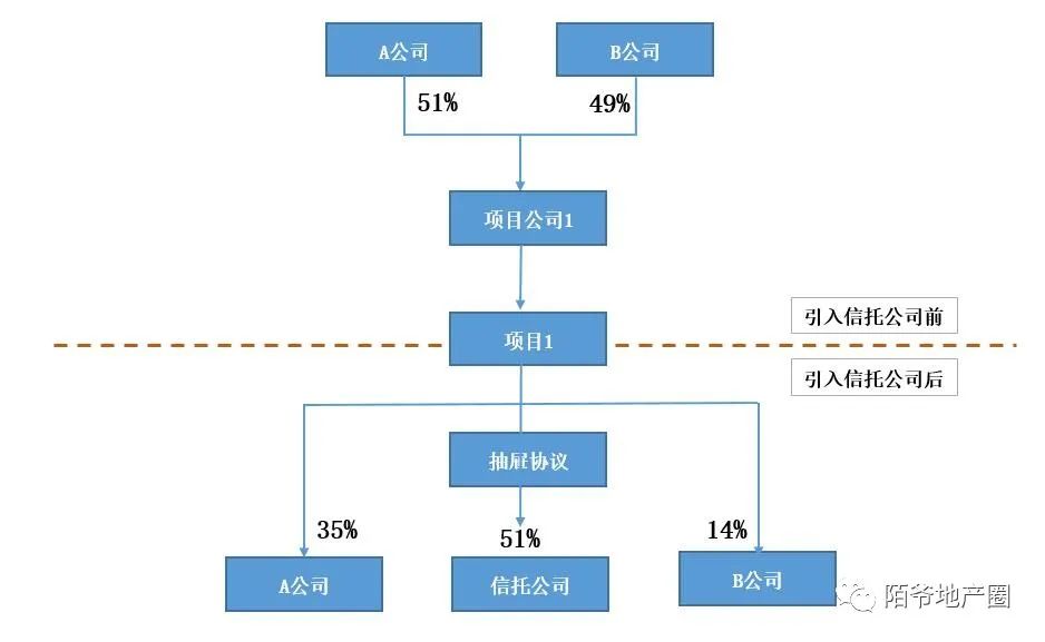 步驟二、通過信托機(jī)構(gòu)進(jìn)行前融,信托公司引入,增持a項目股權(quán)至51%