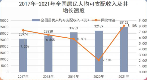 雖從2020年起,中國(guó)經(jīng)濟(jì)就被疫情籠罩,但在2021年人均GDP仍突破8萬(wàn)億元,人均可支配收入也自2019年實(shí)現(xiàn)三連漲,不過(guò)值得注意的是人均消費(fèi)支出卻出現(xiàn)了負(fù)增長(zhǎng)。一方面在于,疫情的沖擊導(dǎo)致了電影院、KTV、餐飲等人流密集的行業(yè)關(guān)停,進(jìn)而極大地降低了消費(fèi)者線下消費(fèi)的意愿;另一方面,人均可支配收入增速的放緩也在一定程度上影響了人們的消費(fèi)預(yù)期。