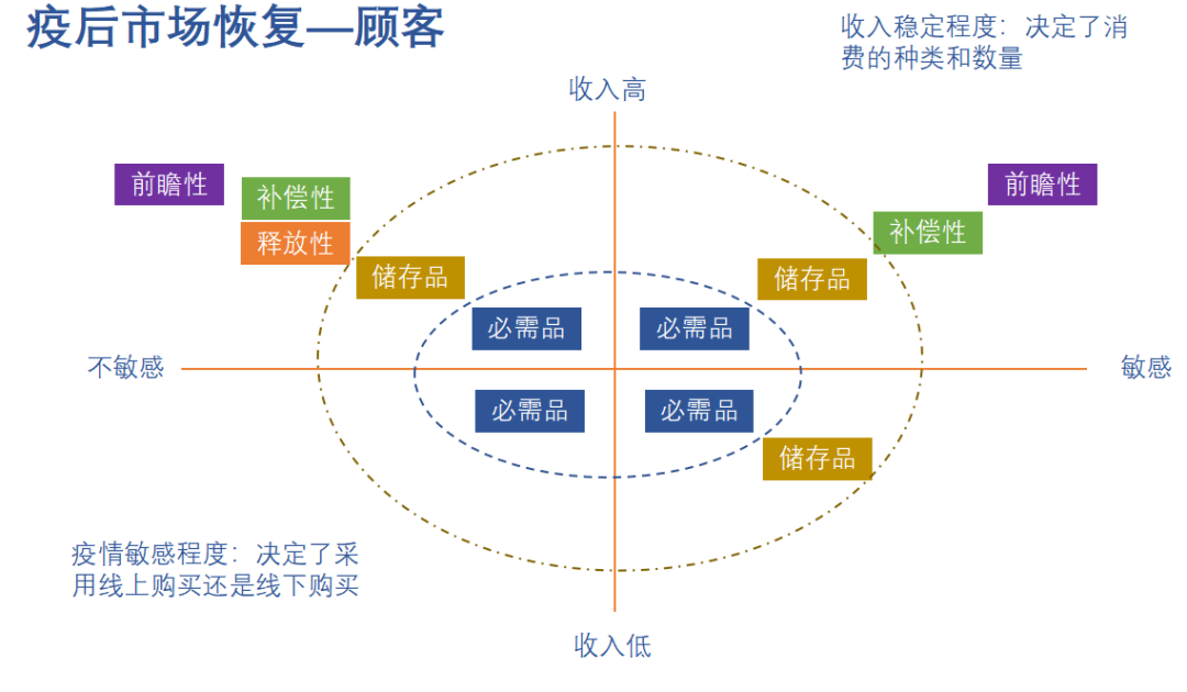 從顧客收入和疫情影響兩個(gè)維度可以把顧客需求分為四個(gè)象限,消費(fèi)者的收入穩(wěn)定程度決定了其消費(fèi)的種類和數(shù)量,種類主要分為必需品、儲(chǔ)存品、釋放性、補(bǔ)償性、前瞻性;疫情敏感程度決定了采用線上購(gòu)買還是線下購(gòu)買。