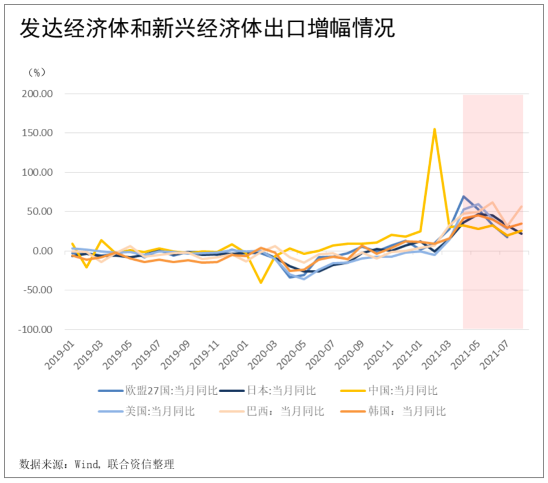 3.供應鏈中斷風險走高對主要經濟體的對外貿易產生一定影響,自2021年5月以來,受供應鏈中斷影響較大的歐美地區出現出口增幅顯著下滑的情況,而受供應鏈中斷擾動較小的中國、巴西以及韓國出口增幅受影響較小。