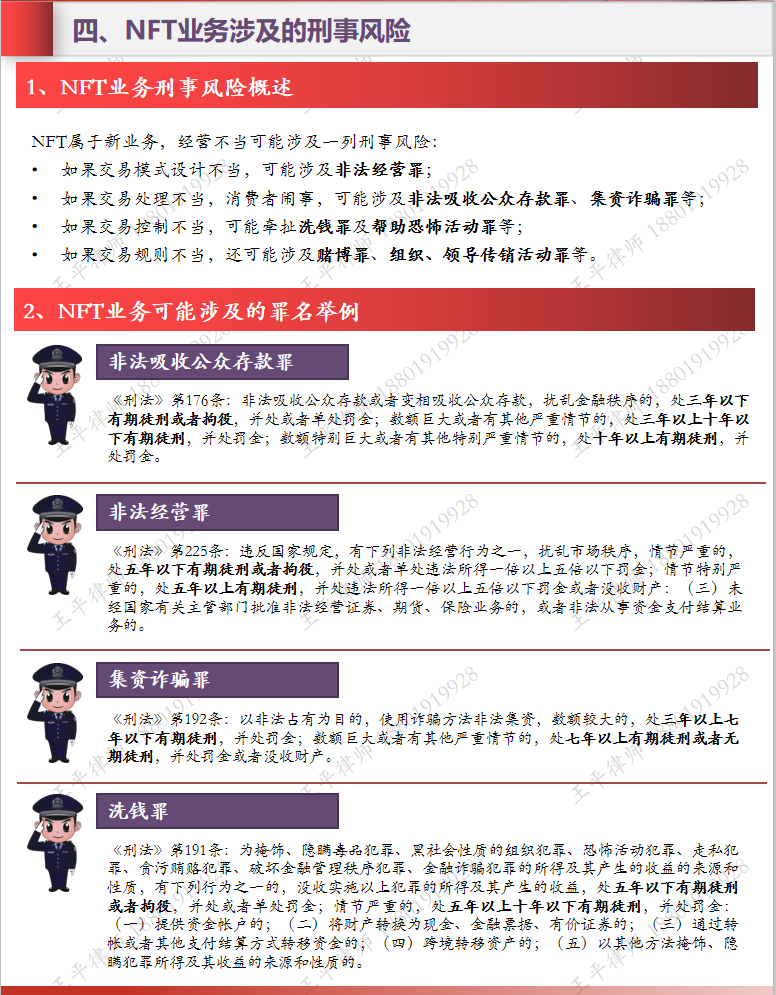 作為一個新興事物,法律規(guī)定尚屬于空白狀態(tài),我們在創(chuàng)新的同時,更需要關(guān)注法律風(fēng)險,尤其是可能觸及的金融風(fēng)險。金融風(fēng)險帶來的后果可能包括刑事犯罪(如非法經(jīng)營罪、非法吸收公眾存款罪、集資詐騙罪、洗錢罪及幫助恐怖活動罪、賭博罪、組織、領(lǐng)導(dǎo)傳銷活動罪等),行政處罰(如違反交易所管理的規(guī)定、期貨衍生品管理、證券發(fā)行、虛擬貨幣等)。因此,法律風(fēng)險防范至關(guān)重要。
