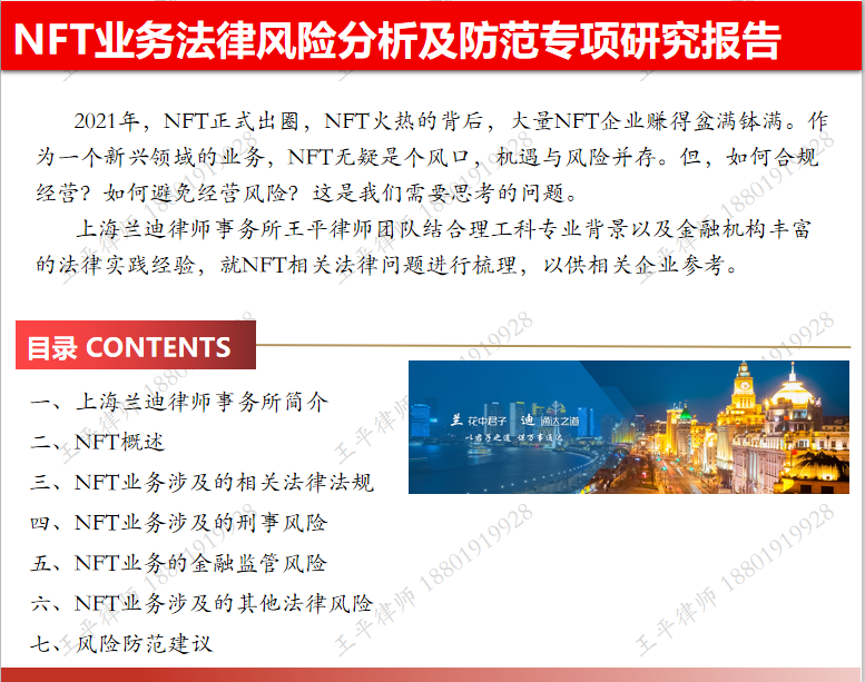 上海蘭迪律師事務(wù)所王平律師團(tuán)隊結(jié)合理工科專業(yè)背景以及金融機(jī)構(gòu)豐富的法律實踐經(jīng)驗,就NFT相關(guān)法律問題進(jìn)行梳理,以供相關(guān)企業(yè)參考。