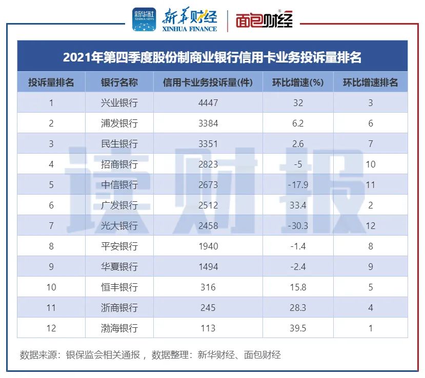 2021年第四季度,興業(yè)銀行、浦發(fā)銀行和民生銀行的信用卡業(yè)務(wù)投訴量位居股份制銀行前三名。其中,興業(yè)銀行第四季度信用卡業(yè)務(wù)投訴量達(dá)到4447件,是唯一單季信用卡業(yè)務(wù)投訴量超過(guò)4000件的股份制銀行。