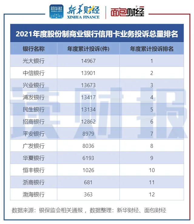 2021年全年,光大銀行、中信銀行、興業(yè)銀行分別位居銀行信用卡業(yè)務(wù)累計(jì)投訴量前三甲。
