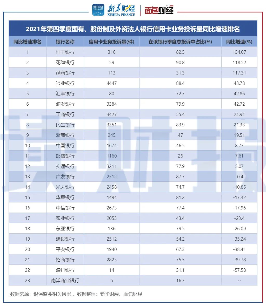從2021年第四季度的同比增速來(lái)看,恒豐銀行和渤海銀行位居股份制銀行前兩位。但是,這主要是由于兩家銀行去年基數(shù)較低造成。即便在翻倍增長(zhǎng)之后,2021年四季度兩家銀行的信用卡業(yè)務(wù)投訴量合計(jì)仍不超過(guò)500件。