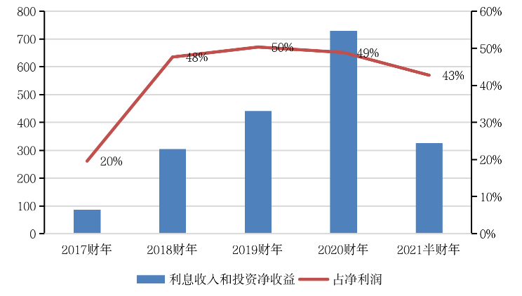 其次,互聯網巨頭通過投資已取得了可觀的收益,成為利潤的重要來源。例如,阿里2018財年以來,投資收益占到凈利潤近半數,其中2020財年,利息、投資收益達到729.56億元,占凈利潤49%。