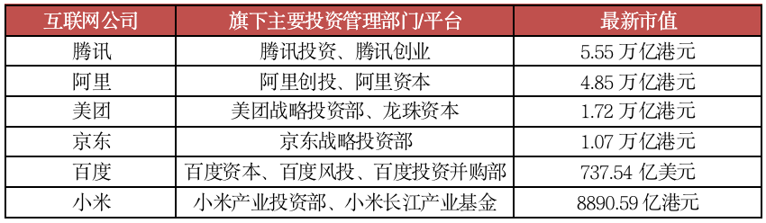 表:互聯巨頭投資平臺與市值