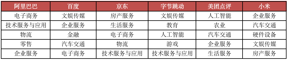 圖:其余6家互聯網巨頭2020年投資數量TOP5的行業列表