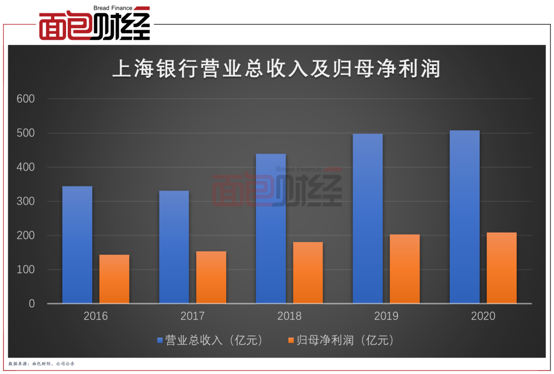 數據顯示,2020年上海銀行實現營業收入507.46億元,同比增長1.90%;實現歸屬于母公司股東的凈利潤208.85億元,同比增長2.89%。