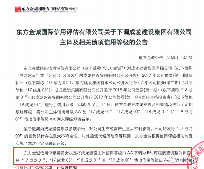 近日,東方金誠公告稱,將成龍建設(shè)集團有限公司(以下簡稱“成龍集團”)主體信用等級由AA下調(diào)為BB,評級展望調(diào)整為負面;將“17成龍01”、“17成龍03”、“18成龍01”和“19成龍01”債項信用等級由AA下調(diào)為BB并移出評級觀察名單。