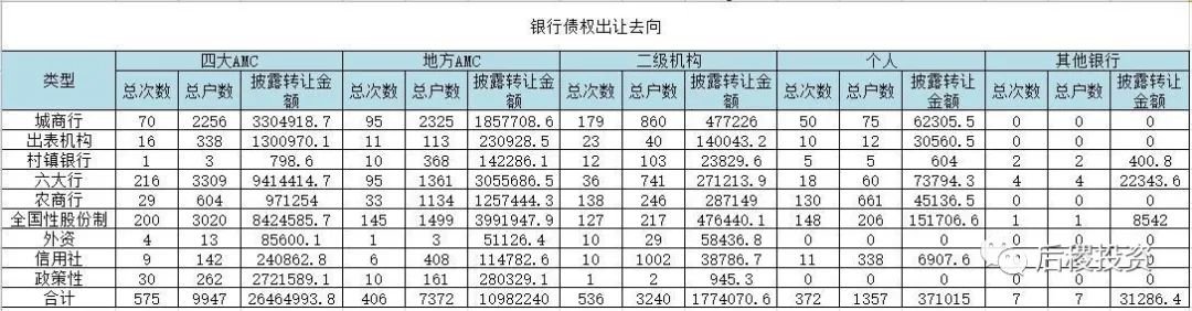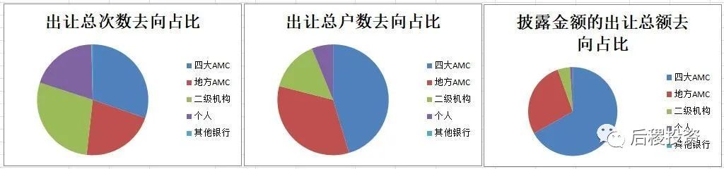 從出讓去向上看,四大AMC和地方AMC的總次數(shù)和總戶數(shù)相近,但總金額上,四大AMC占了將近70%,這是因為四大跟國有六大行的業(yè)務(wù)聯(lián)系更密切,而自然人和二級機構(gòu)雖然也從銀行直接受讓債權(quán),但因監(jiān)管原因通常以單戶債權(quán)為主,故總金額占比較小。銀行出讓至四大AMC的債權(quán)總額為2646億,出讓至地方AMC的債權(quán)總額為1098億元,由此推測出目前四大AMC和地方AMC在銀行債權(quán)出讓一級市場的受讓比例大約為7:3。
