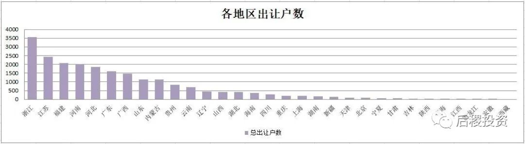 從上圖看,銀行出讓成交次數(shù)前五的省份是山東、浙江、廣東、江蘇和河北;戶數(shù)前五的省份是浙江、江蘇、福建、河南和河北,廣東排第六;而出讓總額排名前五的省份是浙江、河南、廣東、山東和江蘇,福建、遼寧、河北、山西緊隨其后,較其他地區(qū)為高。仍舊可以看出東部地區(qū)省份,銀行的出讓力度較其他地區(qū)為高,當然這也與我國的經(jīng)濟總量分布有關(guān)。