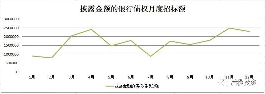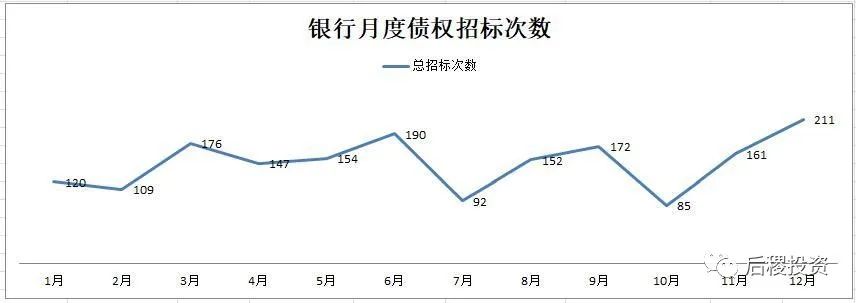 除1月外,銀行月度出讓次數(shù)曲線的區(qū)間為94-206次,區(qū)間中值為150次左右,戶數(shù)區(qū)間為827-2776戶,區(qū)間中值為1800戶左右,而月度出讓成交金額的區(qū)間中值則為350億元左右。1月和7月是公告成交的高峰期,這與業(yè)務(wù)規(guī)律也契合。