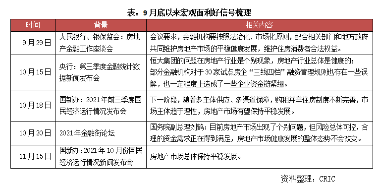 監管層時有發聲,融資預期松動。9月29日,人民銀行、銀保監會聯合召開房地產金融工作座談會。會議要求,金融機構要按照法治化、市場化原則,配合相關部門和地方政府共同維護房地產市場的平穩健康發展,維護住房消費者合法權益。此后,多方都相繼釋放出利好信號,據不完全統計,目前央行、銀保監會、國新辦、國務院副總理等都肯定了房地產平穩、健康發展基調,預示流動性會逐步好轉,房企融資環境將有所改善。