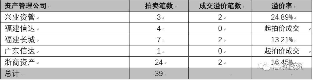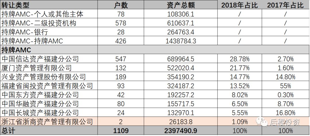 3:2017年~2018年浙商資管不斷加快了省外業(yè)務的布局,在福建不良資產(chǎn)市場的收購端和處置端都有不俗的業(yè)績,特此列入表中以供參考(實際數(shù)據(jù)遠比此表中所示的多,由于信息收集無法全面,僅作投資參考)