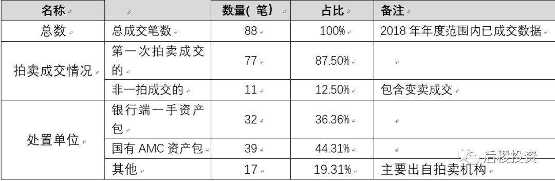由于不良資產(chǎn)交易的成交價很難從公開渠道獲取,且年度交易量龐大,現(xiàn)篩選淘寶司法拍賣中的已成交的債權交易記錄,2018年年度有效的債權交易記錄共計88筆,其中福建地區(qū)債權包一拍77筆,成交率87.5%;資產(chǎn)包來自銀行端的占比37.5%,來自持牌AMC的占比43.18%