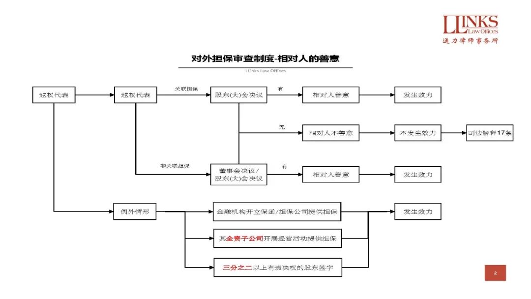 根據(jù)最高院的統(tǒng)計(jì),2006年至2015年全國(guó)法院審結(jié)的455件公司未經(jīng)法定程序?qū)ν鈸?dān)保的商事案件,其中認(rèn)定擔(dān)保合同有效的判決占49.8%; 而認(rèn)定擔(dān)保合同無(wú)效的判決占50.2%, 該等混亂的狀態(tài)在最高院于2019年11月8日頒布《全國(guó)法院民商事審判工作會(huì)議紀(jì)要》(“《九民紀(jì)要》”)后基本告一段落,《九民紀(jì)要》明確了接受對(duì)外擔(dān)保的債權(quán)人需要審查公司內(nèi)部決議的基本原則。