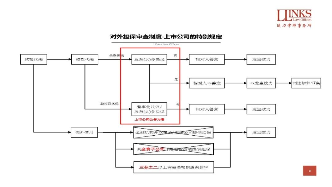 綜上,在普通公司對(duì)外擔(dān)保審查制度的基礎(chǔ)上,《擔(dān)保制度解釋》對(duì)上市公司提出了更高的要求,不但要求以公告為準(zhǔn),還幾乎排除了所有無(wú)須決議的例外情形。