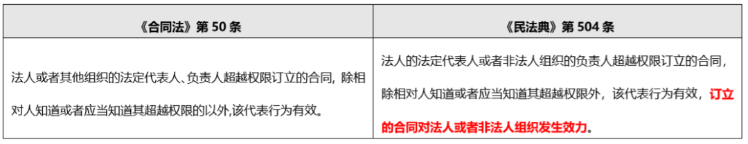從合同無(wú)效到不發(fā)生效力, 最高院在《九民紀(jì)要》和《擔(dān)保制度解釋》中作出的轉(zhuǎn)變, 需要回歸其采用代表權(quán)限制說(shuō)認(rèn)定《公司法》第16條的性質(zhì)進(jìn)行理解。在最高院將違反《公司法》第16條的行為界定為“越權(quán)代表”, 而非違反“效力性規(guī)定”的情況下, 考慮到《合同法》第50條已經(jīng)被《民法典》第504條取代, 那么未經(jīng)決議的對(duì)外擔(dān)保所導(dǎo)致的后果也不再是“無(wú)效”而是“對(duì)公司不發(fā)生效力”。