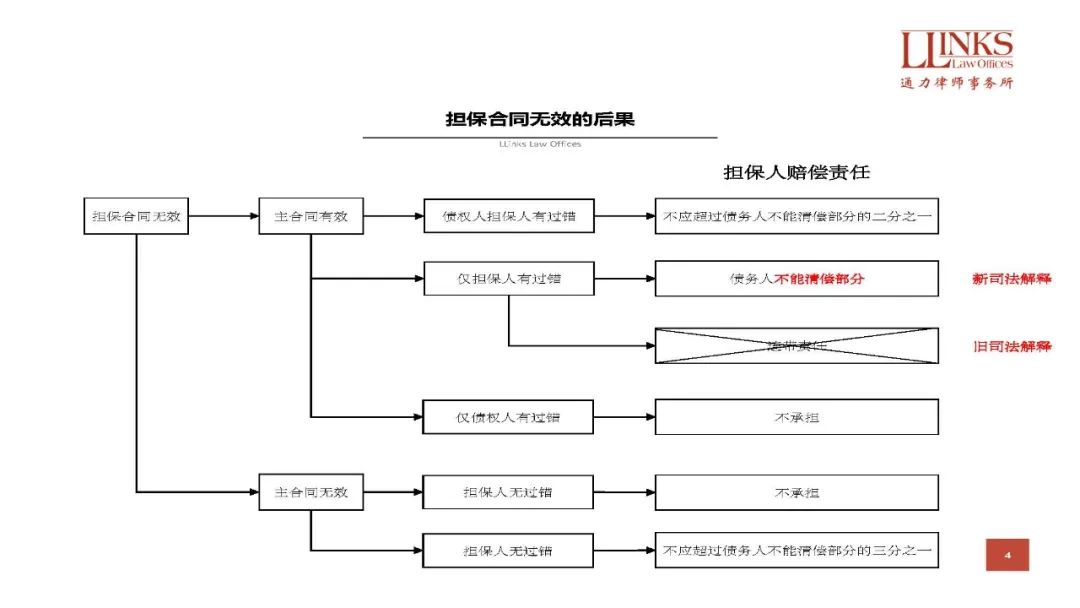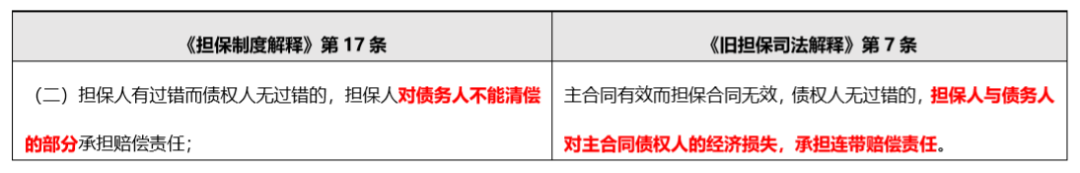說(shuō)細(xì)微, 因?yàn)椤稉?dān)保制度解釋》和《舊擔(dān)保司法解釋》對(duì)擔(dān)保無(wú)效后的賠償責(zé)任所作規(guī)定, 尤其是區(qū)分的各種情況基本一致, 唯一的改動(dòng)僅在主合同有效、擔(dān)保人有過(guò)錯(cuò)而債權(quán)人無(wú)過(guò)錯(cuò)的。