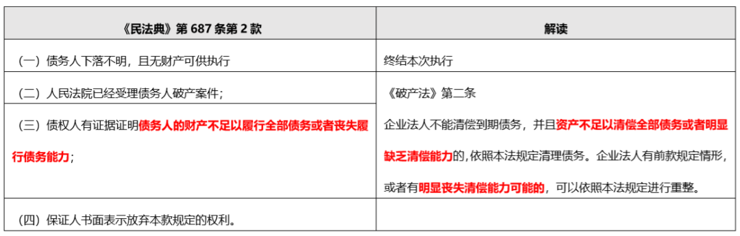 雖然《民法典》第687條第2款規(guī)定了四種例外情形, 但《民法典》的這些規(guī)定實(shí)際參考了《破產(chǎn)法》和執(zhí)行相關(guān)的規(guī)定, 總而言之就是要證明債務(wù)人已經(jīng)無(wú)法清償債務(wù), 才能夠?qū)挂话惚WC人的先訴抗辯權(quán)。