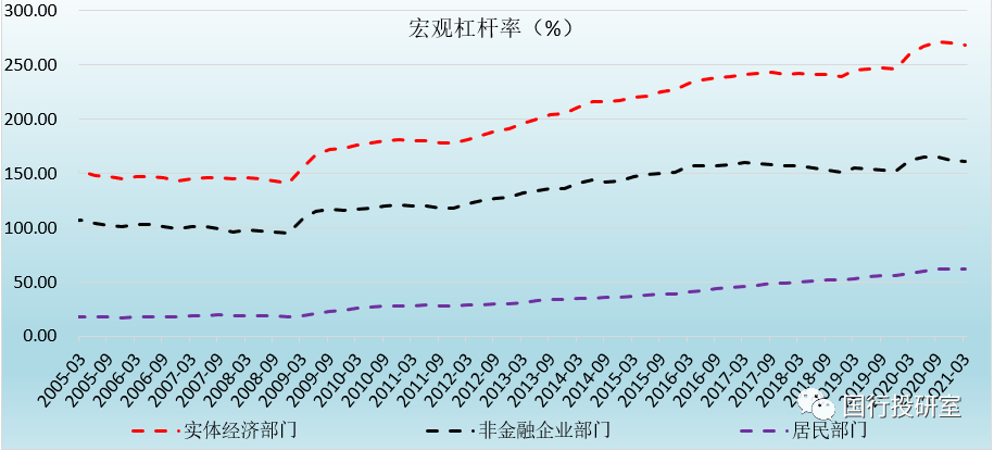 1、2020年為應對疫情,宏觀杠桿率大幅抬升(實體經濟部門、非金融企業部門和居民部門的杠桿率年內最高分別上升24.70個百分點、13.30個百分點和6.10個百分點),因此自2020年下半年以來,降低宏觀杠桿率基本上就已經成為政策導向,實際上自2020年三季度以來,宏觀杠桿率已經連續兩個季度下降了。