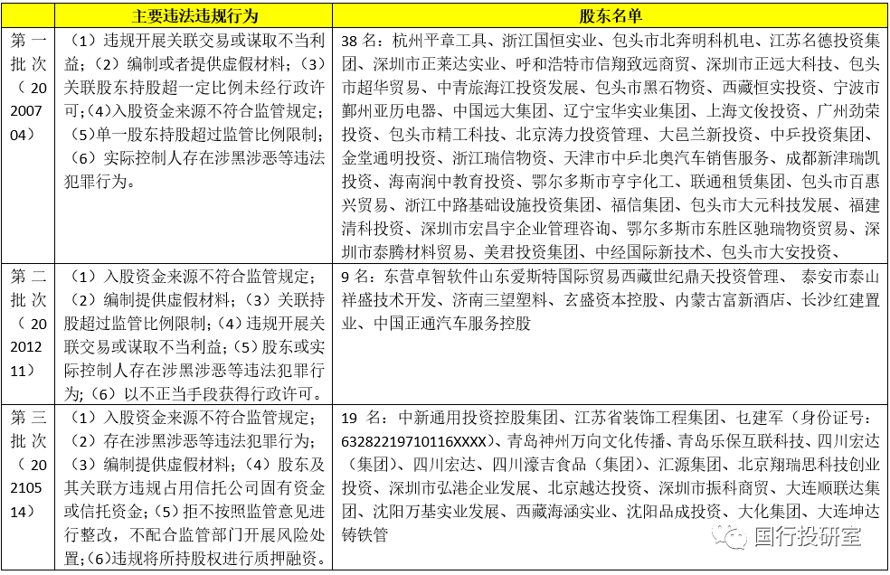 (2)2020年銀保監會開展專項整治“回頭看”,覆蓋4600余家銀行保險機構,不僅首次開展了覆蓋全部商業銀行和保險公司的公司治理監管評估以及銀行保險機構股權和關聯交易專項整治工作,還先后分三批次向社會公開了銀行保險機構重大違法違規股東(合計66家)。