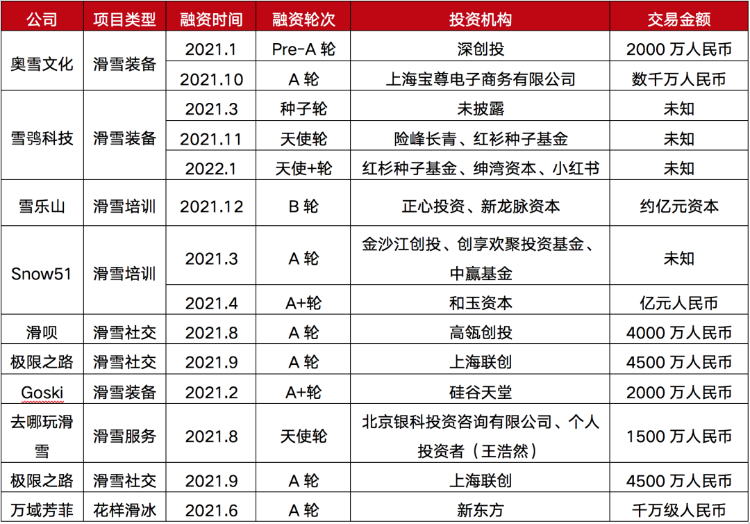 根據(jù)不完全統(tǒng)計,冰雪賽道歷年來發(fā)生投融資共計34.12億元,發(fā)生融資行為59起。融資賽道主要集中在冰雪產(chǎn)業(yè)中的滑雪品類,以專注于滑雪裝備、滑雪培訓(xùn)和滑雪社交平臺的品牌為主要投資項目。在投融資層面,資本對雪經(jīng)濟(jì)的追捧力度遠(yuǎn)大于冰產(chǎn)業(yè)。