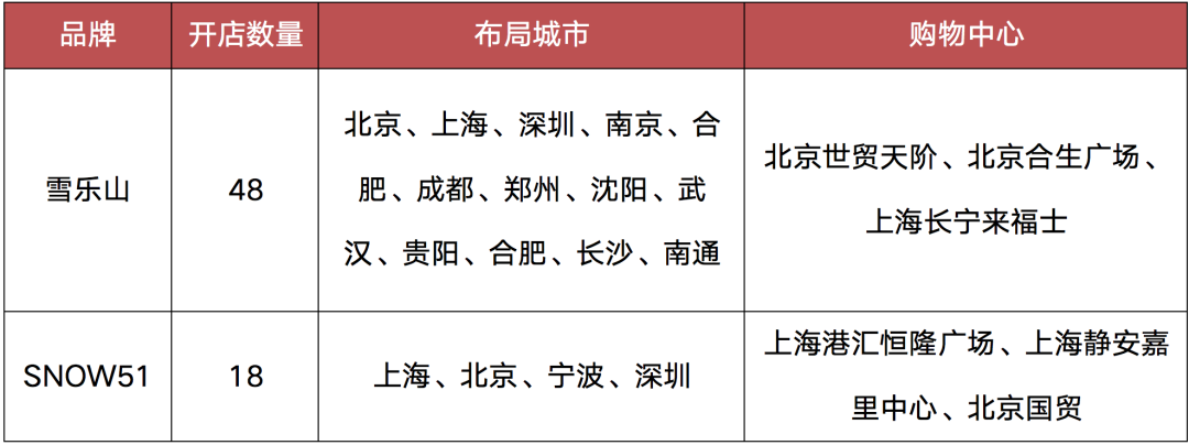 以雪樂山為例,店型分為主力店(600~800平)和迷你店(100平),主力店選址于購物中心,單店投入300萬,資金回籠周期6到12個月,主要布局在一線城市,并向二線城市下沉。而SNOW51則采取會員制高端路線布局一線城市核心商圈,在滑雪運動的基礎(chǔ)上,增加了與品牌聯(lián)營的零售、社交和餐飲服務(wù)。