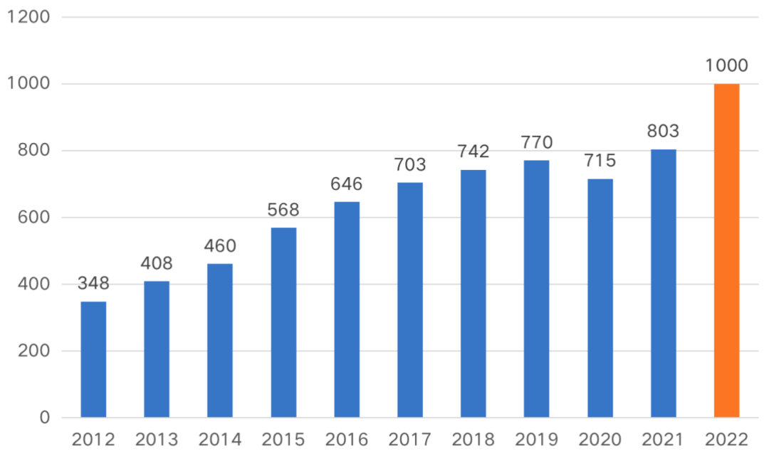 國家體育總局相關(guān)數(shù)據(jù)顯示,2015年全國滑雪場數(shù)量為568家,2019年這個數(shù)字達(dá)到了770家,由于2020年疫情,滑雪場規(guī)模出現(xiàn)小幅下降,減少至715家,預(yù)計2022年滑雪場數(shù)量將實現(xiàn)新一輪增長,全國范圍內(nèi)滑雪場數(shù)量將達(dá)到1000余家。