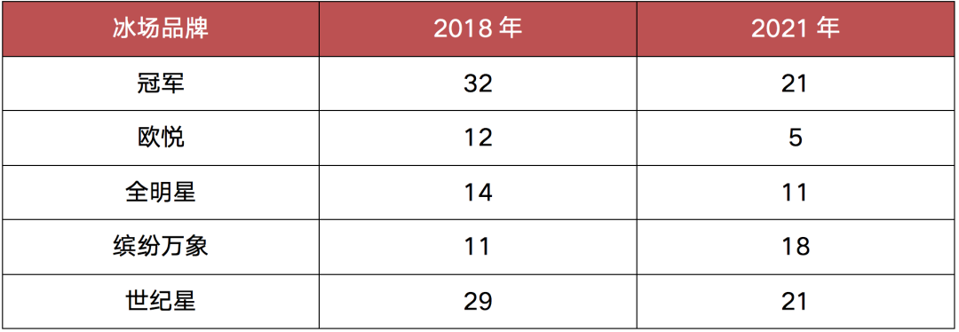 表:連鎖商業(yè)冰場品牌2018年與2021年店面數(shù)量對比