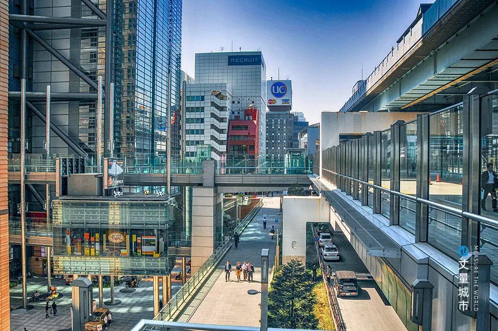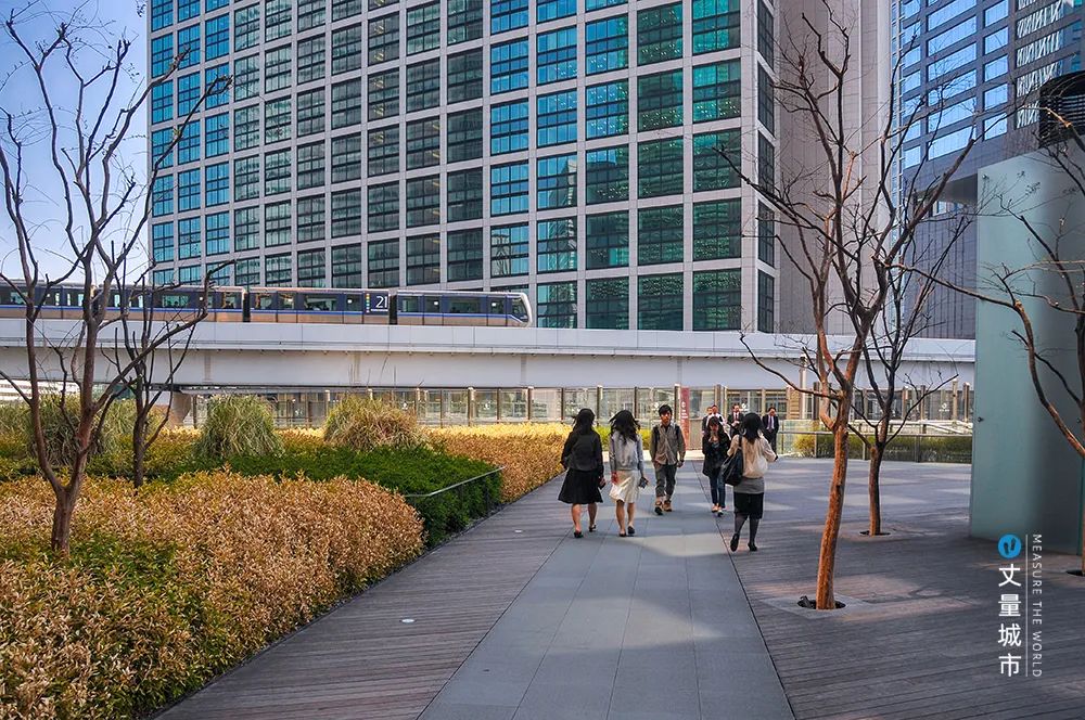 基于公共空間管理要求,聯(lián)合協(xié)會拿出了立體步行道路體系的解決方案:汐留地區(qū)寫字樓、商業(yè)、住宅、車站等多種功能高度復(fù)合,通過分層的立體交通建設(shè),實現(xiàn)步行、車行、軌道交通的分別治理。