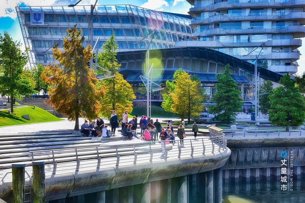 例如區(qū)域內(nèi)的聯(lián)合利華總部,大樓底層并不像傳統(tǒng)的總部辦公那樣「與世隔絕」,居民和游客可以在此隨便穿行。大堂內(nèi)還設(shè)有便利店等商業(yè)設(shè)施,室外的大臺階承擔(dān)著公共活動舉辦地的角色。