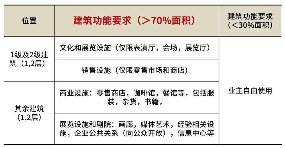 此外,企業(yè)建筑1-2層必須具備「公共職能」屬性,其中70%以上的建筑面積僅限于文化展覽、商業(yè)零售功能。