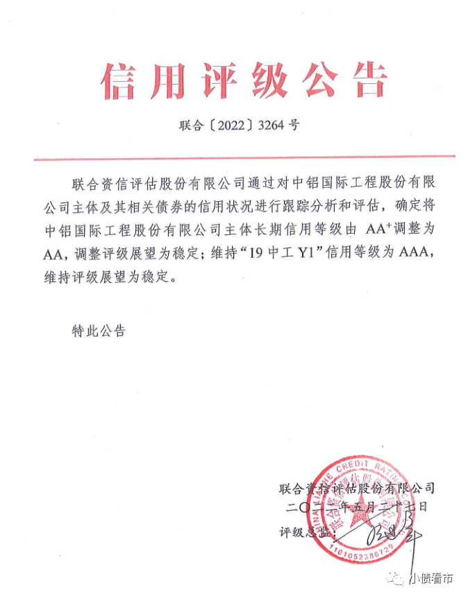 近日,聯(lián)合資信公告稱,將中鋁國(guó)際(02068.HK/601068.SH)長(zhǎng)期債務(wù)評(píng)級(jí)從AA+下調(diào)至AA,調(diào)整評(píng)級(jí)展望為穩(wěn)定,維持“19中工Y1”信用等級(jí)為AAA。